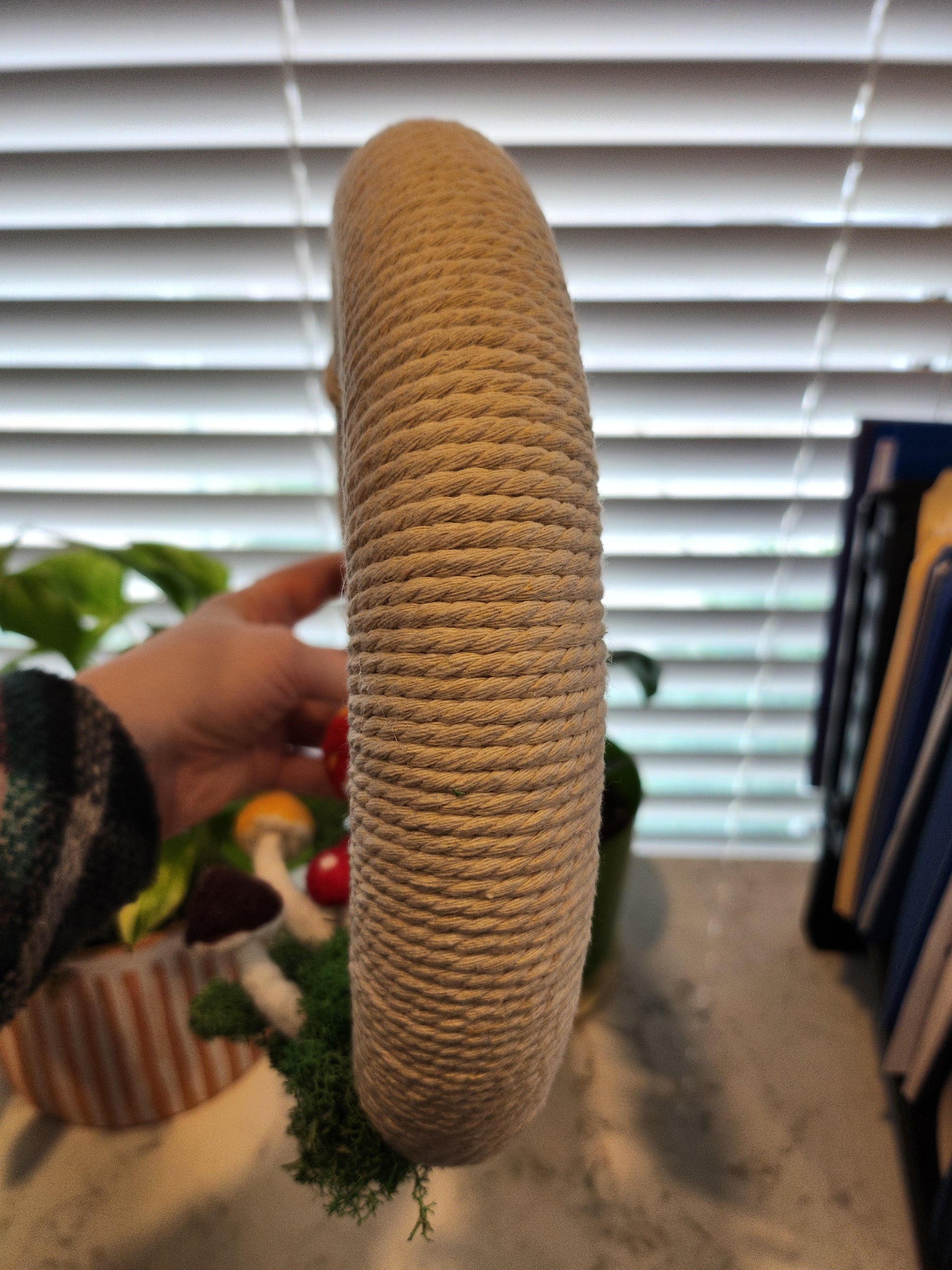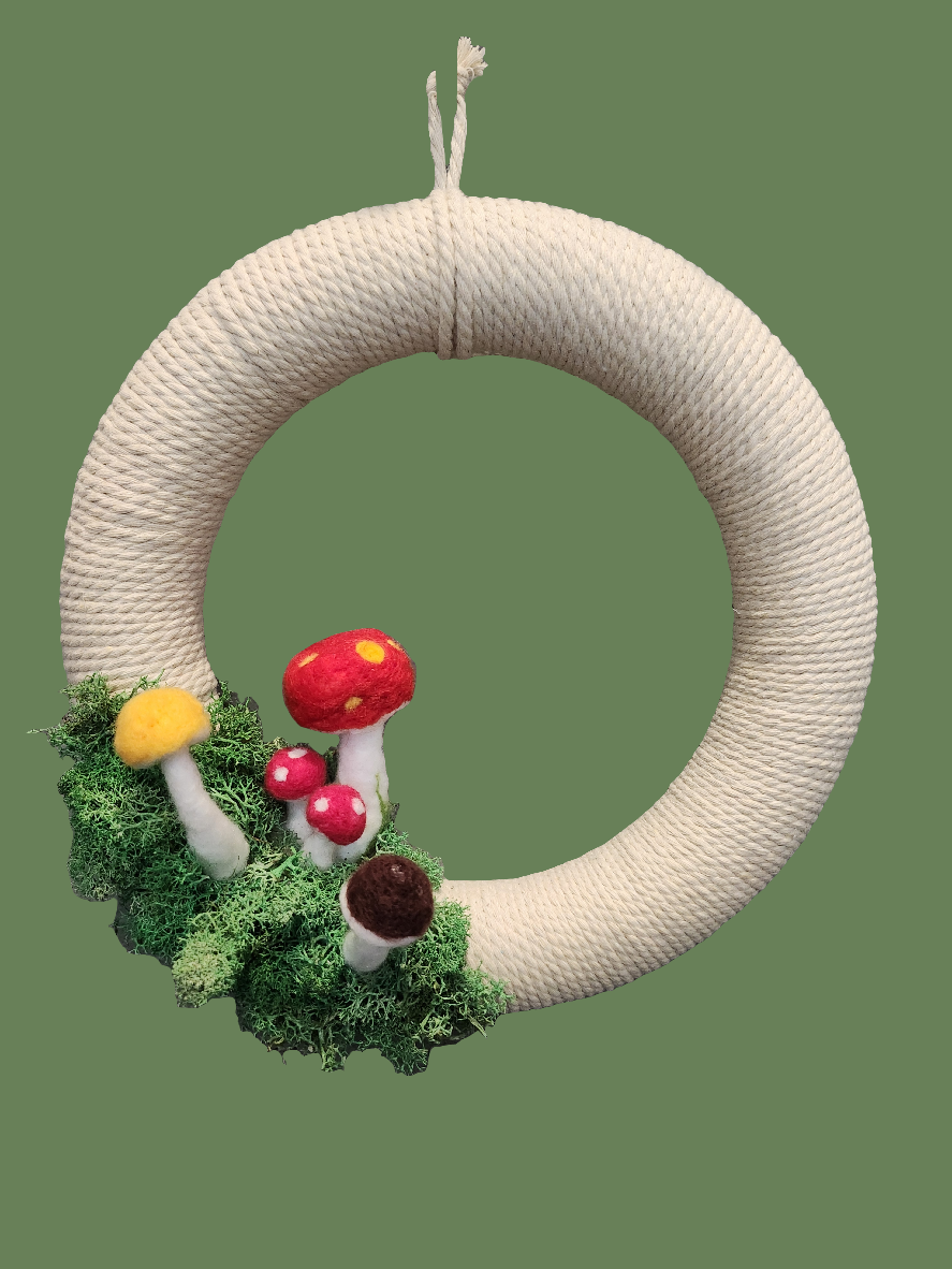 I used red, yellow, brown and white on the mushrooms and the moss is a vibrant green. The wreath is wrapped with an off white twisted cotton macrame cord.