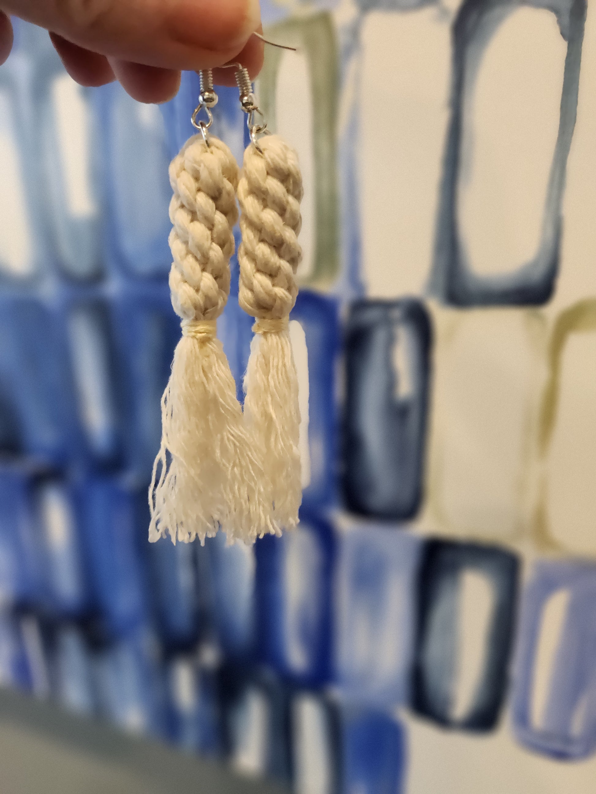 Each pair is made using soft cotton macramé cord and hypoallergenic surgical steel hooks.