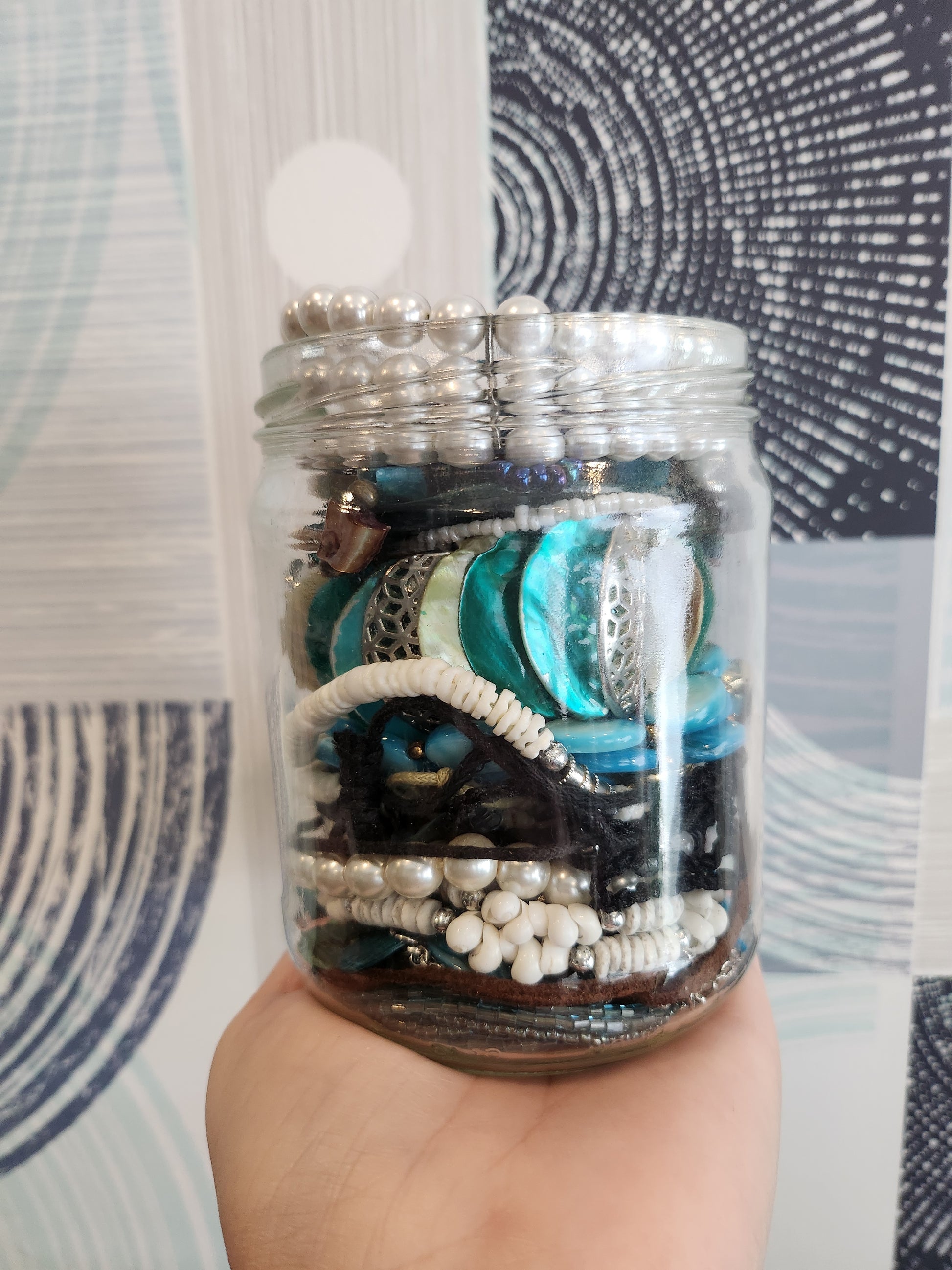 Dive into the dreamy depths of Mermaid Lagoon—a curated jar of treasures that captures the magic of the sea. Hand-selected in hues of serene blues and vibrant turquoise, this collection features an enchanting mix of shimmering pearls, seashell charms, and coastal-inspired sparkle.